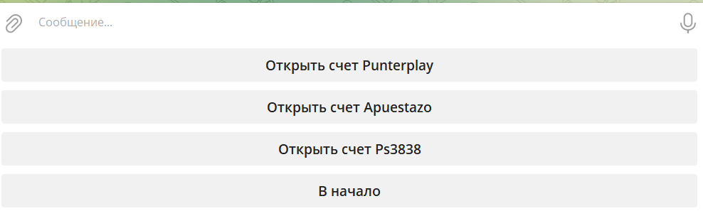 Чтобы открыть счет Punterplay, PS3838 или Apuestazo, необходимо перейти в Телеграм и в поиске найти @mediatoragentbot или перейти по этой ссылке.