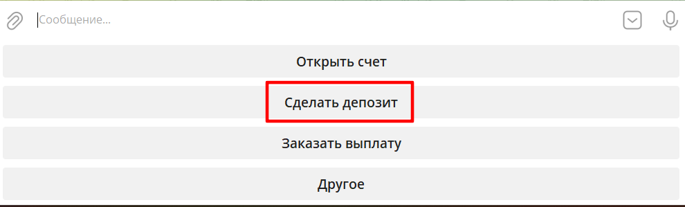 Чтобы сделать депозит, перейдите в Телеграм-бот.