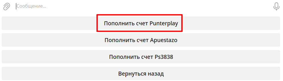 После чего, откроется меню с выбором игровой платформы, например “Пополнить счет Punterplay”: